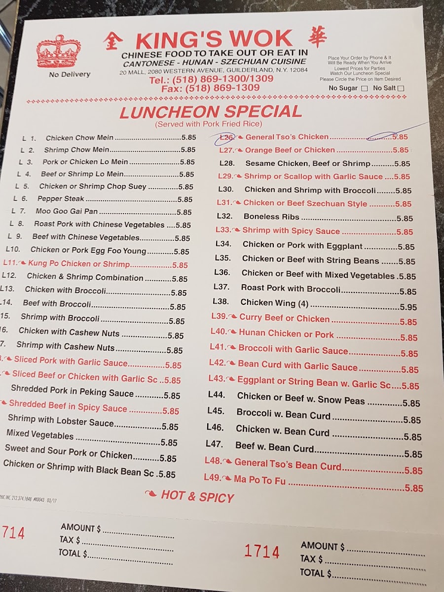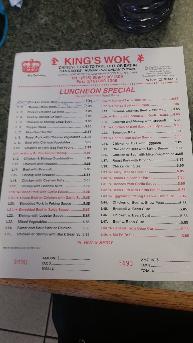 King's Wok offers a diverse and flavorful menu that caters to a variety of tastes, from vegetables to seafood and everything in between. For vegetarians, options like Vegetable Delight ($10), String Bean with Garlic Sauce ($9), and Broccoli with Garlic Sauce ($9) are perfect choices. The Chef's Specialty section features standout dishes such as the Lung Fong Platter ($18) and Lobster & Beef ($22), both rich in flavor. For poultry lovers, the Chicken with Snow Peas ($12) and Moo Goo Gai Pan ($13) are favorites, while those who enjoy egg foo young can try the Shrimp Egg Foo Young ($12) or Lobster Egg Foo Young ($14). The Luncheon Specials like the Chicken and Shrimp with Broccoli ($9) provide a satisfying mid-day meal. Their Lo Mein selections, such as the Beef Lo Mein ($11) and Lobster Lo Mein ($15), are hearty and full of taste. Additionally, the Fried Rice options, from Young Chow Fried Rice ($11) to Shrimp Fried Rice ($12), offer a filling side. For those craving something spicy, the Hunan and Szechuan Style dishes like Orange Chicken ($14) and Pork with Garlic Sauce ($13) deliver a bold kick. To start off, appetizers like Crab Rangoon (12 pieces) ($7) and Fried Wonton (12 pieces) ($6) are popular choices. Finally, their seafood options like Shrimp with Lobster Sauce ($16) and Shrimp with Cashew Nuts ($15) are a hit for seafood enthusiasts. Whether you're looking for something light or indulgent, King's Wok has an extensive menu that is sure to satisfy.
